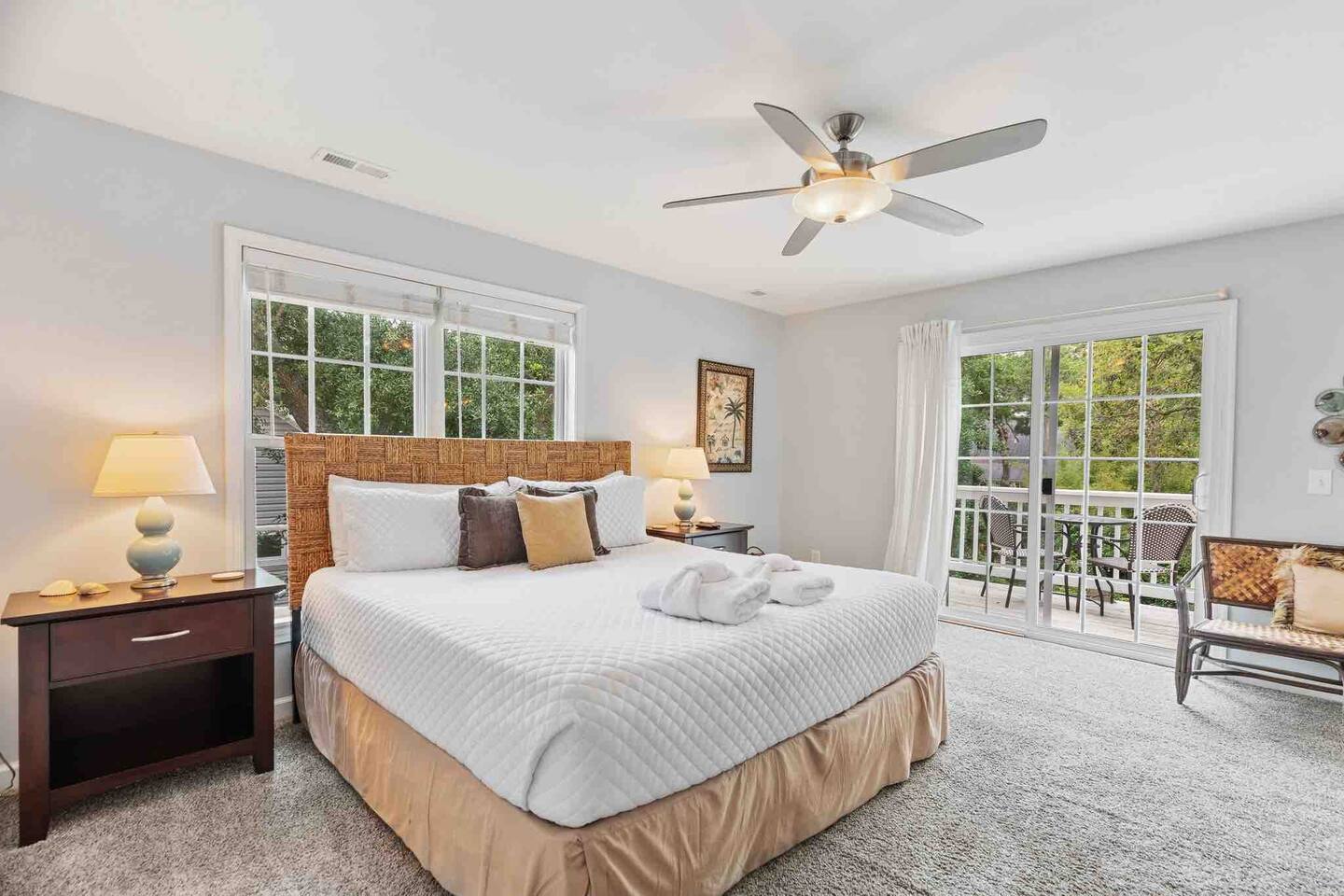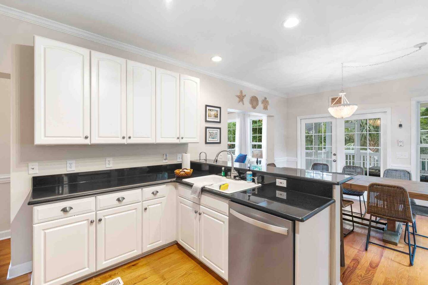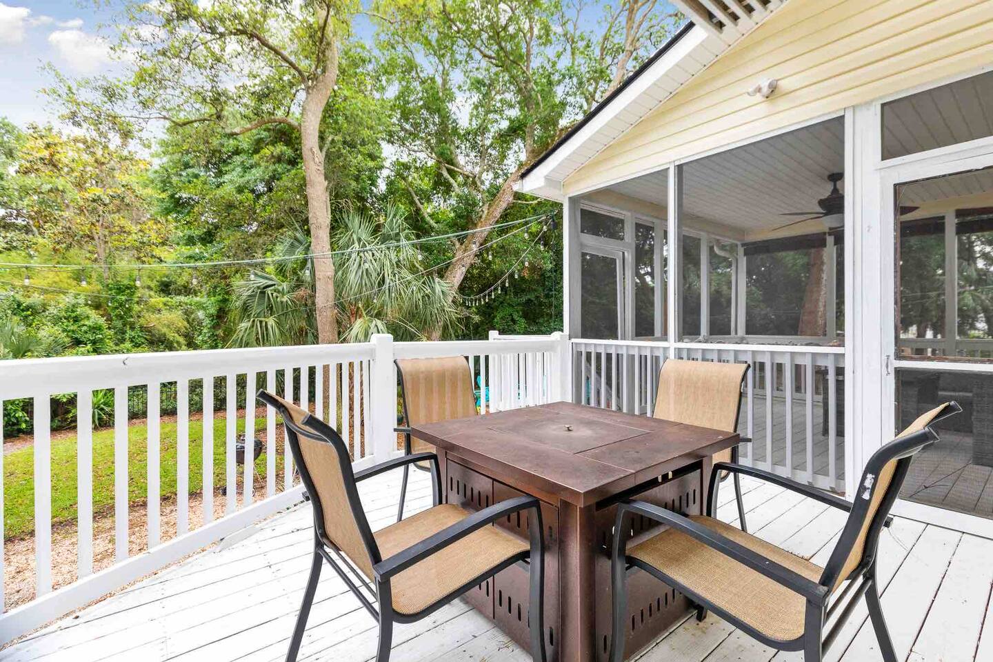 Welcome to 'Happy Ours,' a spacious and elegant home designed for comfort, connection, and fun. With soaring ceilings, luxury linens, and welcoming beachy décor, it's the perfect retreat. Main Living Area (Main Floor): - Open-concept living space with a large, comfortable leather sectional. - Big-screen TV for movie nights. Gourmet Kitchen: - A chef's dream with granite countertops and stainless steel appliances. - Bar seating for four. - Fully stocked with cookware, dishes, and children's dinnerware. - Keurig and drip coffee maker. Game Room (Third Floor): - 60-game classic arcade system. - Foosball table. - Big-screen TV with comfortable seating. Sleeping Arrangements: - First Floor: Cozy bedroom with a full-size bed, adjacent to a full bathroom with a walk-in shower. - Second Floor Master Suite: King bed, private deck, and a stunning en-suite bathroom with a soaking tub and walk-in shower. - Second Floor Guest Rooms: Two bedrooms, each with a queen bed, sharing a modern bathroom. - Third Floor Bunk Room: Custom-built twin-over-full bunks. Outdoor Living: - Three decks to enjoy the coastal air. - Screened porch with a comfy couch. - Large, private backyard with tropical palm and citrus trees. - Wood-burning fire pit. - Charcoal grill. - Convenient outdoor shower. Amenities for Your Convenience: - High-speed WiFi and Smart TVs. - Dedicated workspace. - Washer and dryer. - Pack 'n Play available. Folly Beach Business License #11-21-260873 Folly Beach STR License #STR22-00025
