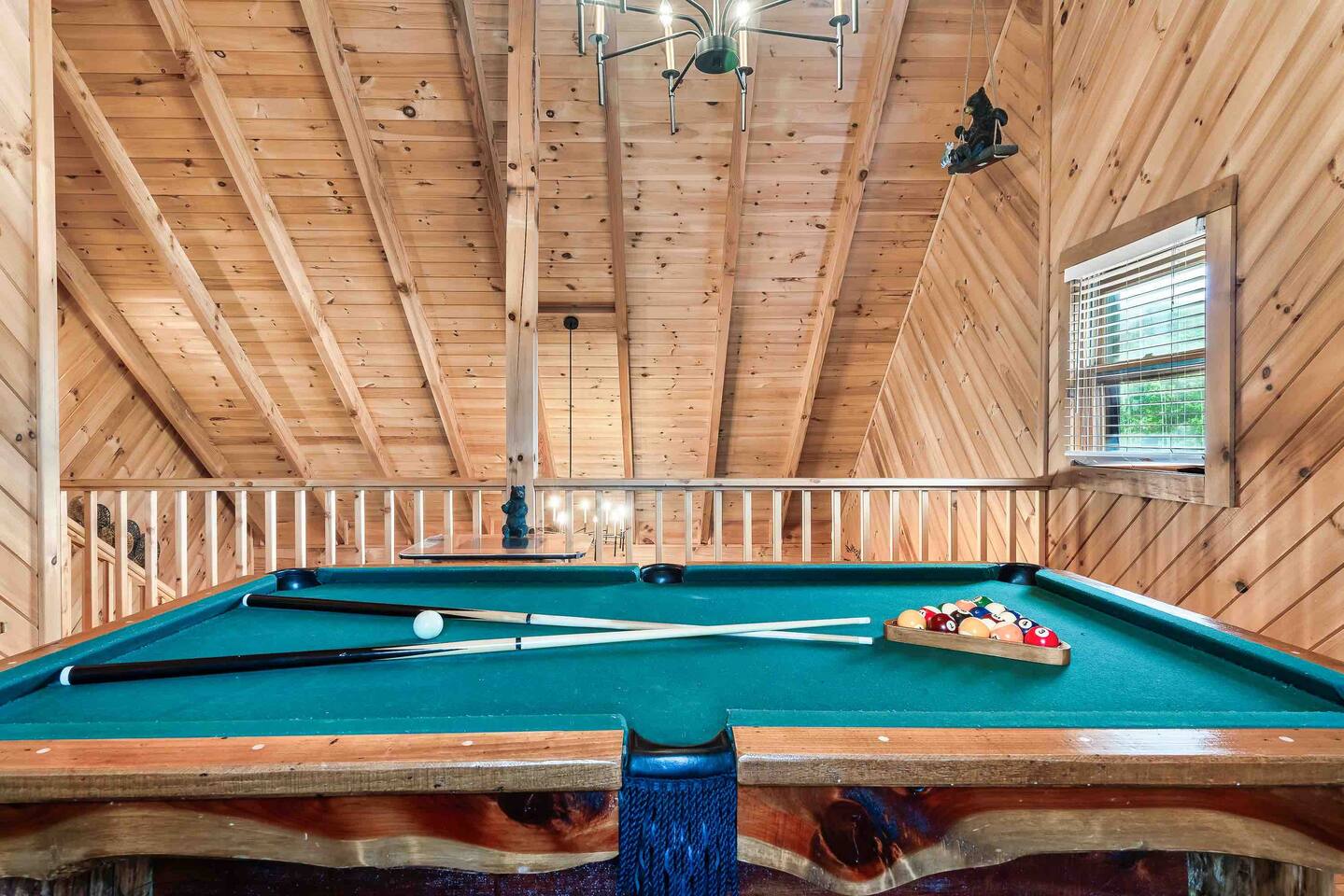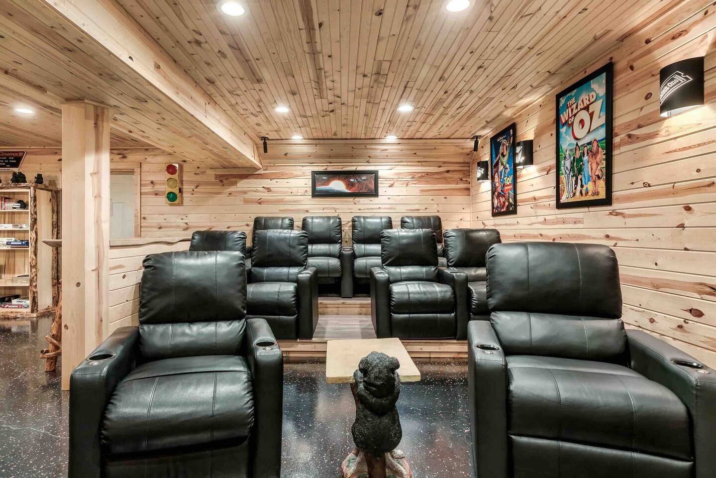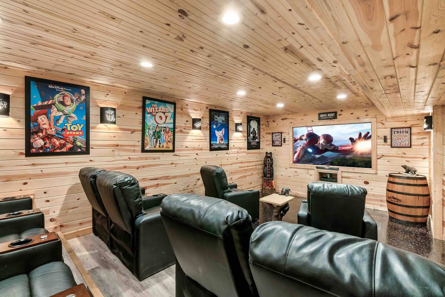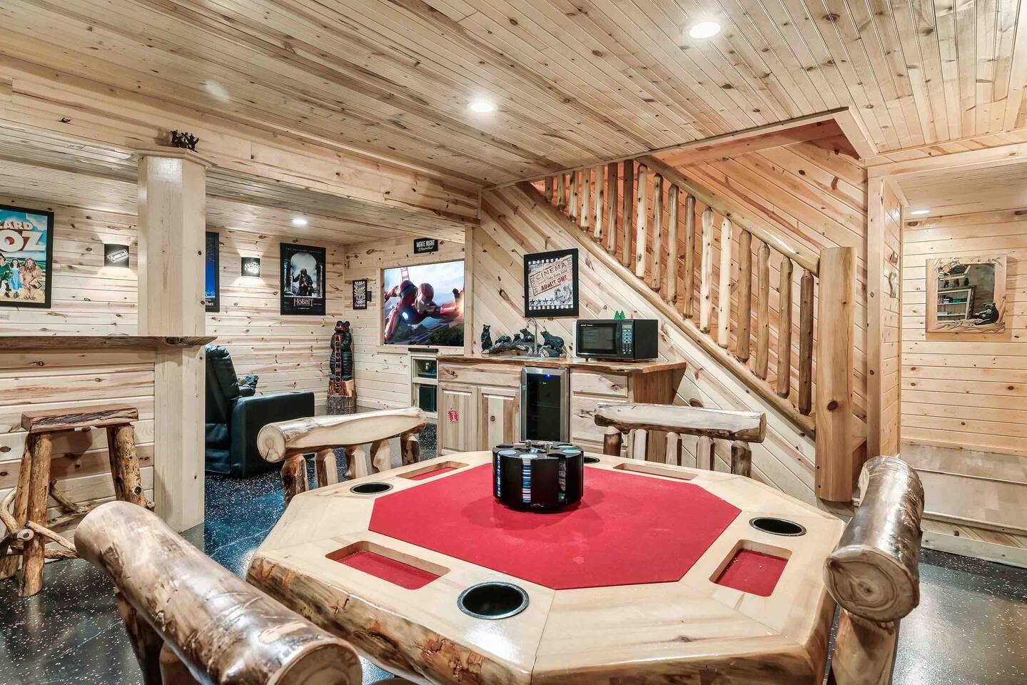 A sprawling deck wraps around the entire house, providing gorgeous panoramas of the surrounding beauty. Soak in the private hot tub or relax around the gas firepit. A convenient location near Pigeon Forge and Gatlinburg keeps you close to amusement parks, attractions and the area’s top-rated attractions. Inside, three floors of living space include two game rooms with billiards, poker table and an arcade game, an in-home movie theater, and welcoming mountain décor. The upstairs Master is a spacious king bedroom, with amazing bathroom, complete with a deep soaking tub and tiled shower. The main floor is home to 2 cozy Queen bedrooms and a shared full bath with shower/tub combo. The kitchen, laundry and living areas are also on the floor. The lower level includes 2 awesome bunk rooms, a full bath with step-in shower, plus a game room and movie theater!