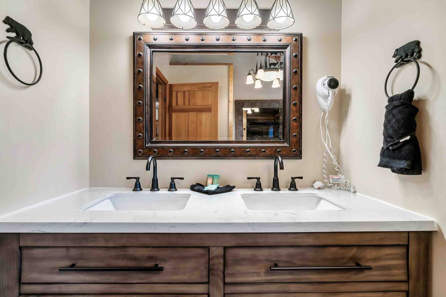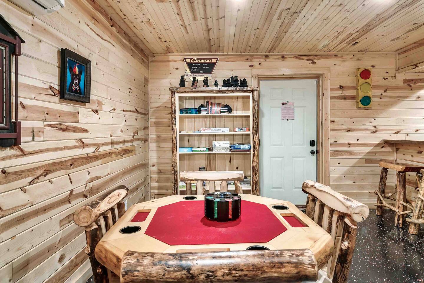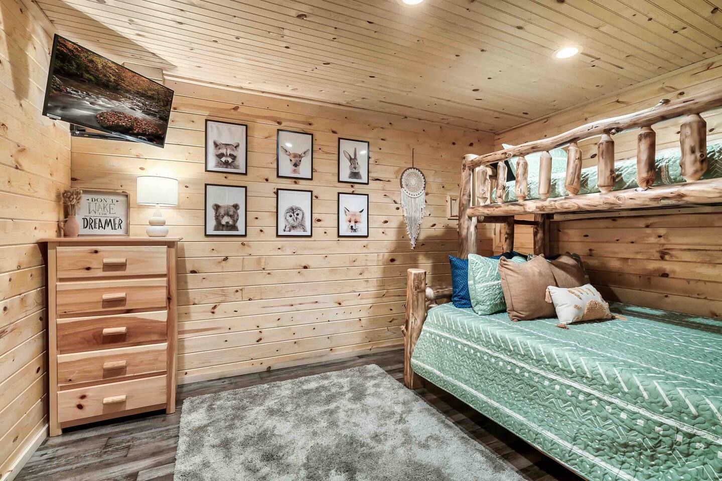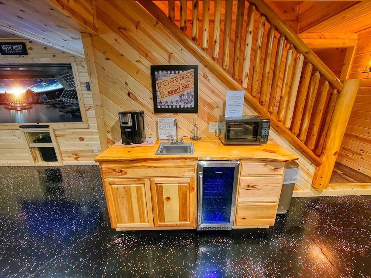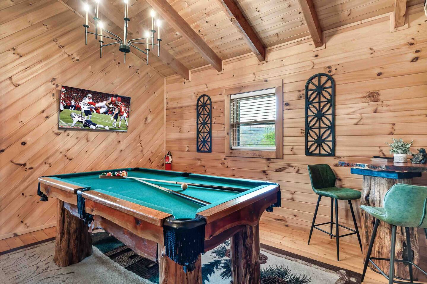 A sprawling deck wraps around the entire house, providing gorgeous panoramas of the surrounding beauty. Soak in the private hot tub or relax around the gas firepit. A convenient location near Pigeon Forge and Gatlinburg keeps you close to amusement parks, attractions and the area’s top-rated attractions. Inside, three floors of living space include two game rooms with billiards, poker table and an arcade game, an in-home movie theater, and welcoming mountain décor. The upstairs Master is a spacious king bedroom, with amazing bathroom, complete with a deep soaking tub and tiled shower. The main floor is home to 2 cozy Queen bedrooms and a shared full bath with shower/tub combo. The kitchen, laundry and living areas are also on the floor. The lower level includes 2 awesome bunk rooms, a full bath with step-in shower, plus a game room and movie theater!